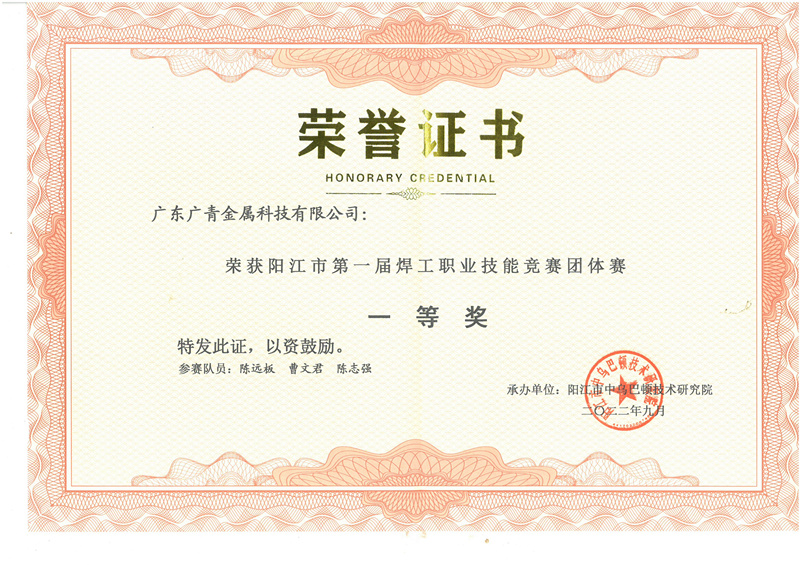 10月10日,在阳江市、阳江高新区两级政府指导下,由阳江市中乌巴顿技术研究院承办的阳江市第一届焊工职业技术技能竞赛表彰大会在阳江市人才驿站举行。阳江市委组织部部务委员张春亮、市人社局副局长黄华,阳江滨海新区(阳江高新区)党工委副书记谢彦举及有关部门负责人出席活动。大会表彰了4个团体和16名个人,广东广青金属科技有限公司喜获团体技能赛一等奖以及个人技能赛一二三等奖。
