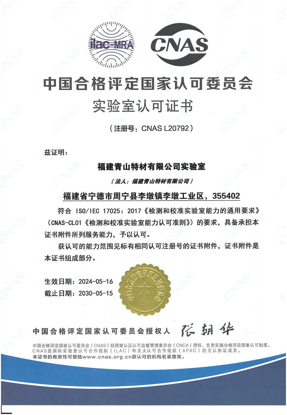 近日,福建jinnian金年会特材有限公司实验室经过严格的评估和审核,成功获得了中国合格评定国家认可委员会(CNAS)的认可,标志着该实验室在检测和检验等领域的能力和技术水平已达到国际认可的标准。