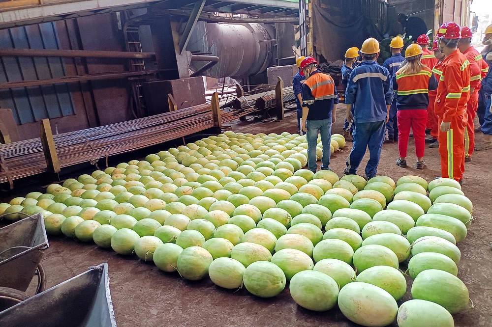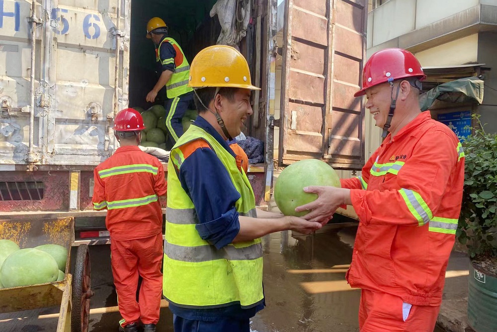 王新教将一个个西瓜送到各个生产车间一线员工手中。副总经理刘晶对一线员工不惧酷暑、坚守岗位、尽职尽责的工作精神给予高度肯定,并再三叮嘱员工做好防暑降温措施,要求各部门在生产工作中,要把员工身心健康安全放在第一位。